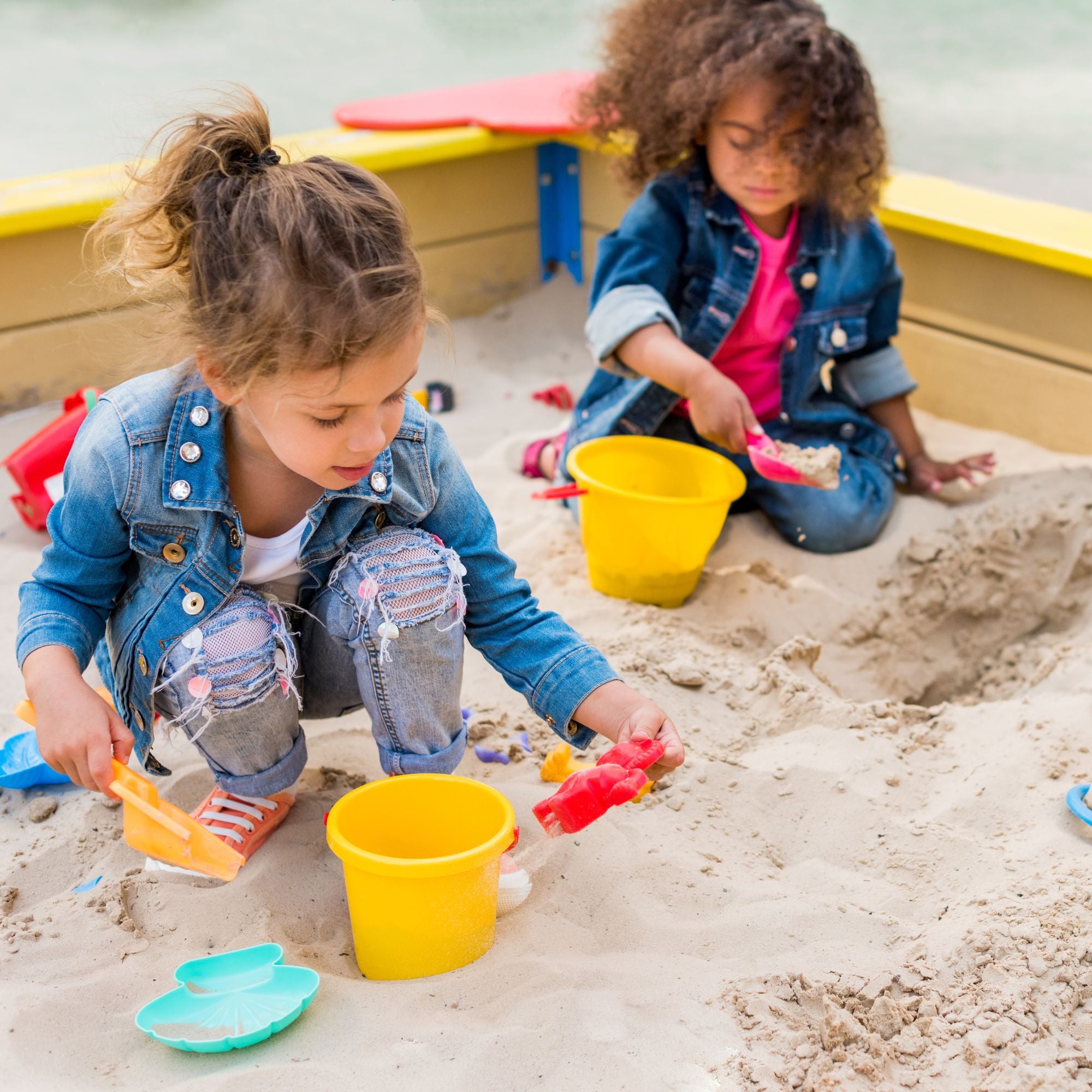 14° CHILDREN PLAYING AROUND FIVE MOUNDS OF SAND